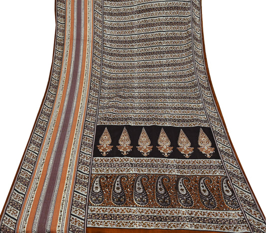 Indian Vintage Brown & Saffron Saree Printed Pure Cotton Indian Sari Craft Fabric 5Yd Soft Sewing Sarong Wrap Boho Floral Dress making