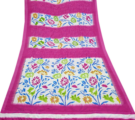 Indian Vintage Sari Ivory & Pink Moss Crepe Printed Sarees 5yd Craft Fabric Sewing Floral Soft Dress making Quilting Crafting Upcycle Used