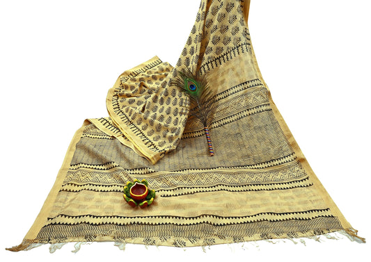 Indian Vintage Sari Beige Pure chanderi Silk Block Printed Sarees 5Yd Craft Zigzag Zari Border Ethnic Dress Making Crafting Quilting