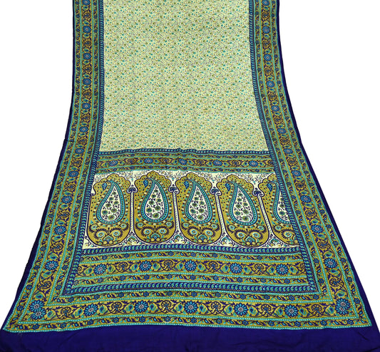 Indian Vintage Sari Ivory & Blue Printed 100% Pure Satin Silk Sarees 5yd Sewing Craft Fabric Dress Making Wrap Upcycle Quilting Crafting