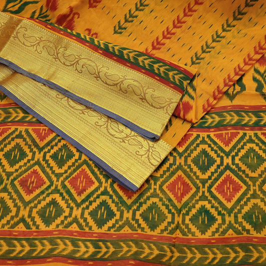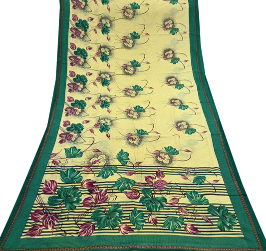Indian Vintage Sari Yellow & Green Pure Cotton Printed Sarees Craft Fabric Soft 5Yd Sarong Wrap Boho Fabric Kimono Quilting Crafting Upcycle
