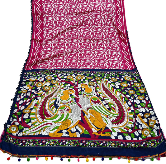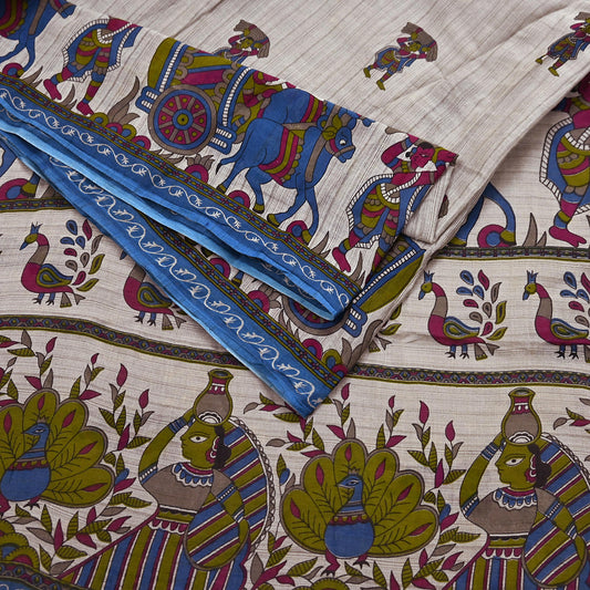 Indian Vintage Sari Kalamkari Printed Pure Cotton Saree Fabric Soft Floral 5Yd Sarong Wrap Fabric Peacock Dress making Crafting Quilting