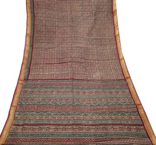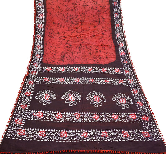 Indian Vintage Sari Red & Brown Batik Printed Saree 100% Pure Cotton 5Yd Craft Fabric Soft Sewing Sarong Wrap Boho Quilting Dress Making