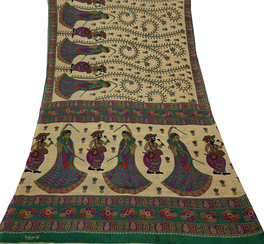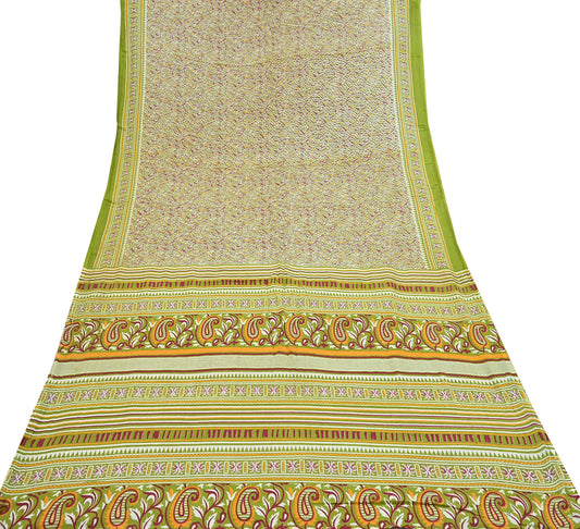 Indian Vintage Sari Beige & Green Pure Cotton Printed Sarees Craft Fabric Soft 5Yd Sarong Wrap Boho Fabric Kimono Quilting Crafting Upcycle