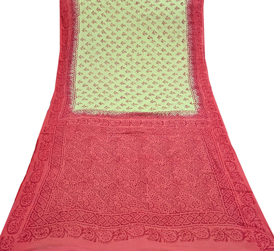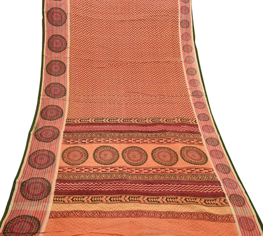 Indian Vintage Green & peach Saree Block Printed Pure Cotton Sari Craft Fabric Soft 5Yd Sewing Sarong Wrap Boho Quilting Dress making