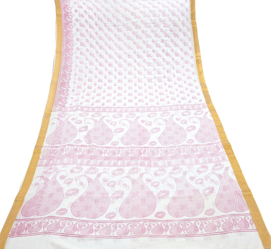 Indian Vintage Sari White & pink Printed 100% Pure Cotton Sarees Craft Fabric 5Yd Sewing Sarong Wrap Boho Quilting Crafting zari border