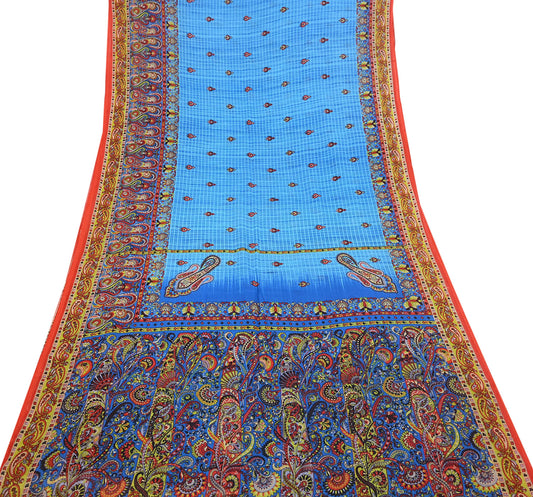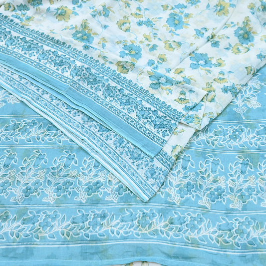 Indian Vintage Sari Blue Printed 100% Pure Cotton Sarees Craft Fabric 5Yd Sewing Sarong Wrap Boho Floral Quilting Crafting