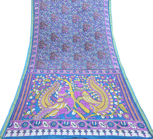 Indian Vintage Sari Blue & Purple Kalamkari Printed Pure Cotton Saree Fabric Soft Floral 5Yd Sarong Wrap Fabric Peacock