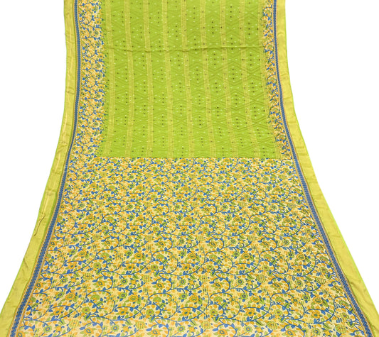 Indian Vintage Sari Green Printed Pure Cotton Saree Craft Fabric 5Yd Sewing Sarong Wrap Boho Floral Crafting Upcycle Quilting Used