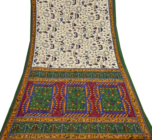 Indian Vintage Ivory & green Saree Warli Print Pure Cotton Sari Craft Fabric 5Yd Soft Sewing Sarong Wrap Boho Dress making Crafting Quilting