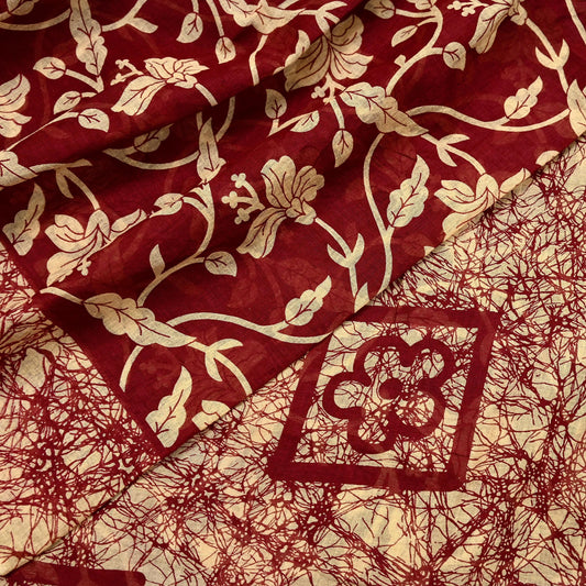 Indian Vintage Sari Beige & maroon Batik Printed Saree 100% Pure Cotton 5Yd Craft Fabric Soft Sewing Sarong Wrap Boho Quilting Dress Making