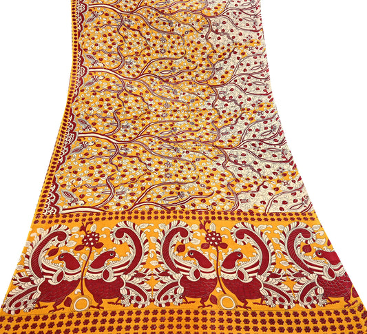 Indian Vintage Sari Yellow & Red Kalamkari Printed Pure Cotton Saree Fabric Soft Floral 5Yd Sarong Wrap Fabric Peacock