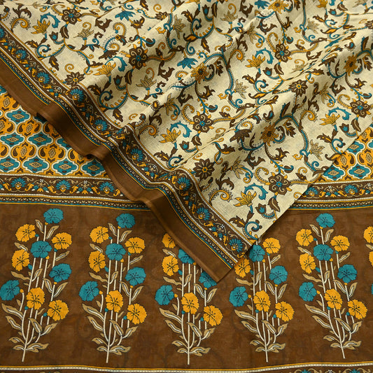 Indian Vintage Sari Beige & Brown Printed 100% Pure Cotton Saree Craft Fabric 5Yd Soft Sewing Sarong Wrap Boho Dress Making Quilting