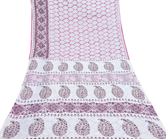 Indian Vintage Sari White & Pink Printed Pure Cotton Sarees Craft Fabric 5Yd Sewing Sarong Wrap Boho Floral Quilting Dress making