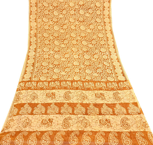 Indian Vintage Sari Brown & Ivory Printed 100% Pure Cotton Saree Craft Fabric 5Yd Soft Sewing Sarong Wrap Boho Dress Making Quilting
