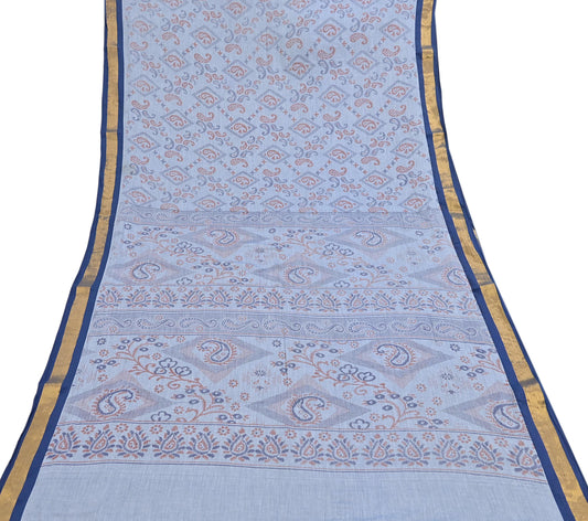Indian Vintage Sari Blue Printed Pure Cotton Sarees Craft Fabric 5Yd Soft Sewing Sarong Wrap Boho Floral Quilting Dress making Zari border