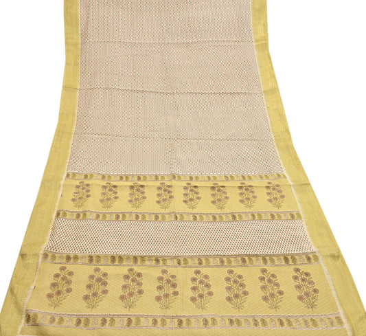 Indian Vintage Ivory & Yellow Saree Printed Pure Cotton Sari Craft Fabric 5Yd Soft Sewing Sarong Wrap Boho Floral Dress making Crafting