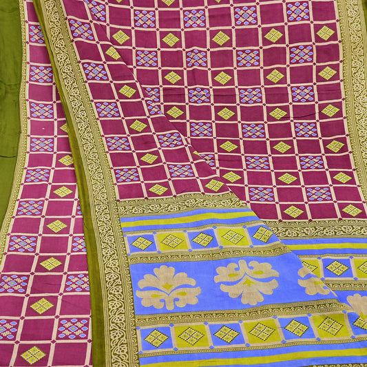 Indian Vintage Purple & Green Sarees Pure Cotton Block Printed Sari 5yd Sewing Craft Fabric DressMaking Soft Crafting Quilting Upcycle