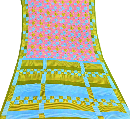 Indian Vintage Sari Pink & Multi Printed 100% Pure Cotton Saree Craft Fabric 5Yd Soft Sewing Sarong Wrap Boho Stripes Dress making Quilting