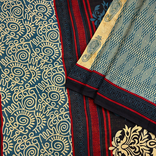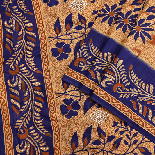 Indian Vintage Sari Blue & Beige Printed Pure Cotton Sarees Craft Fabric 5Yd Soft Sewing Sarong Wrap Boho Floral Quilting Dress making