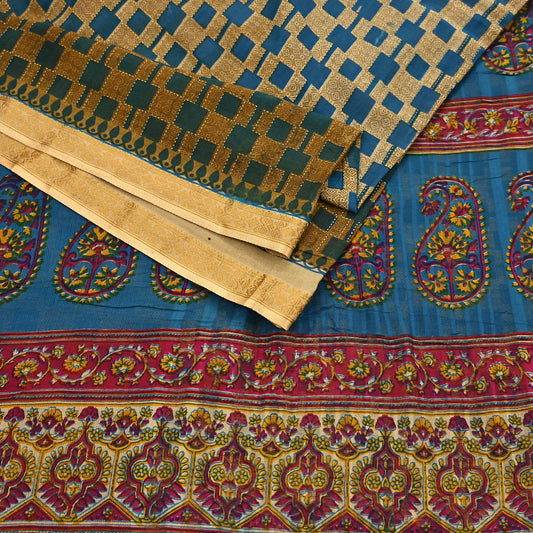 Indian Vintage Yellow & Teal Blue Saree Printed 100% Pure Cotton Sari Craft Fabric 5Yd Soft Sewing Sarong Wrap Dress Making Quilting