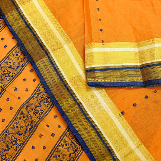 Indian Vintage Sari Orange Pure Cotton Hand Woven Saree Zari 5Yd Craft Fabric Floral Ethnic Sarong Dress making Crafting Quilting Zari