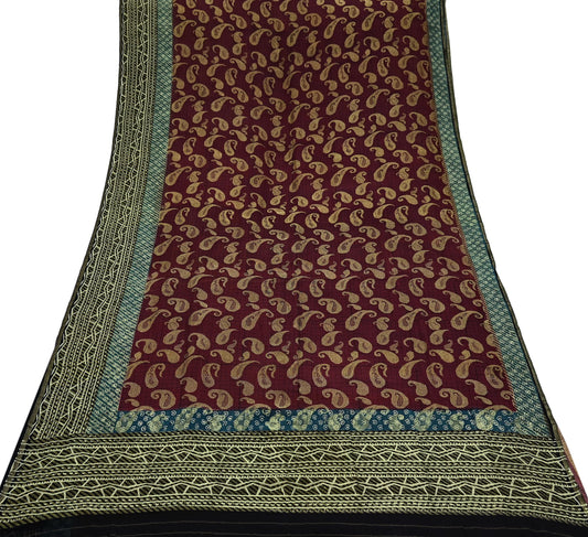 Indian Women Vintage Maroon & Black Saree 100% Pure Georgette Silk Printed Sari Sewing 5yd Soft Craft Fabric Stripes Dress Making Crafting