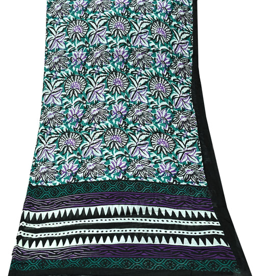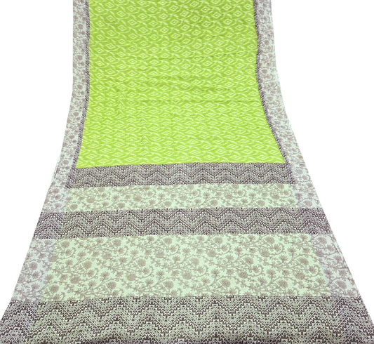 Indian Vintage Sari Green & Ivory Printed Pure Cotton Sarees 5Yd Craft Fabric Soft Sewing Sarong Wrap Boho Upcycle quilting Dress making