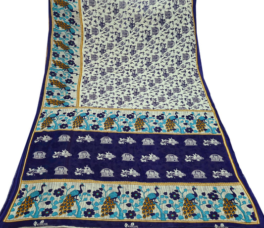 Indian Vintage Blue & Cream Saree Printed 100% Pure Cotton Sari Craft Fabric Soft 5Yd Sewing Sarong Wrap Boho Peacock