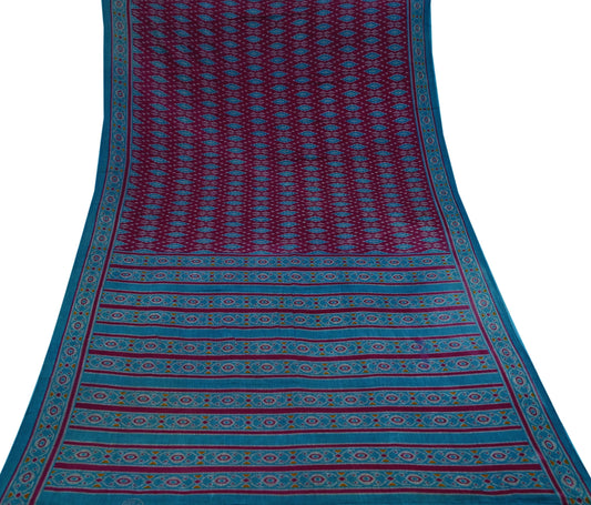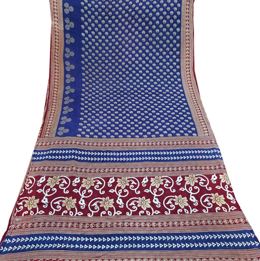 Indian Vintage Sari Maroon & Blue Printed Sarees Pure Cotton Craft Fabric Soft 5Yd Sewing Sarong Wrap Boho Floral Dress making Quilting