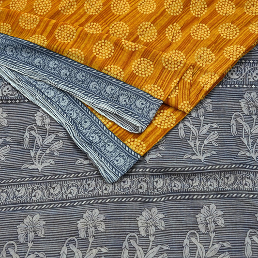 Indian Vintage Gray & Mustard Saree Printed Pure Cotton Sari Craft Fabric 5Yd Soft Sewing Sarong Wrap Boho Floral Dress making Crafting