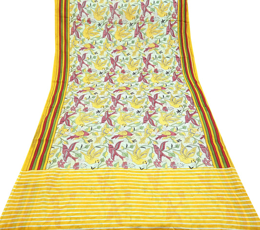 Indian Vintage Sari White & Yellow Printed 100% Pure Cotton Saree Craft Fabric 5Yd Soft Sewing Sarong Wrap Boho