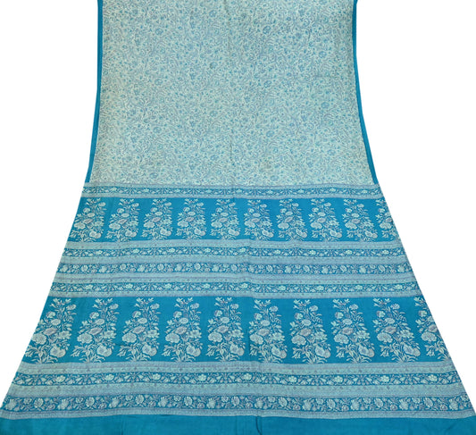 Indian Vintage Saree Blue & White Pure Silk Printed Sari 5yd Craft Fabric Sewing Floral Soft Wrap Sarong Quilting Used