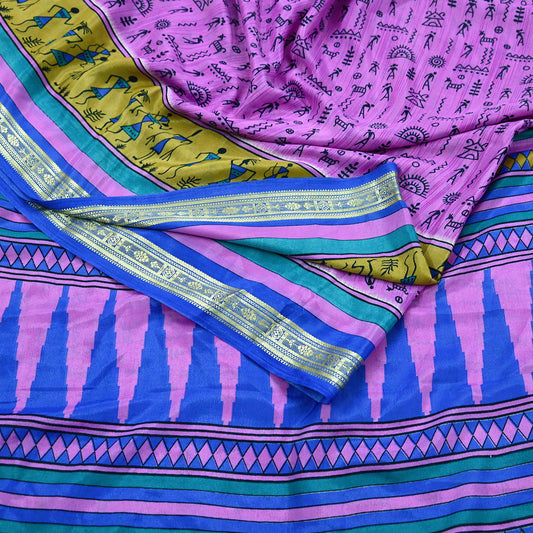 Indian Vintage Saree Pink & Blue Moss Crepe Warli Printed Sari 5yd Sewing Soft Craft Fabric Dressmaking For Crafting Quilting Upcycle