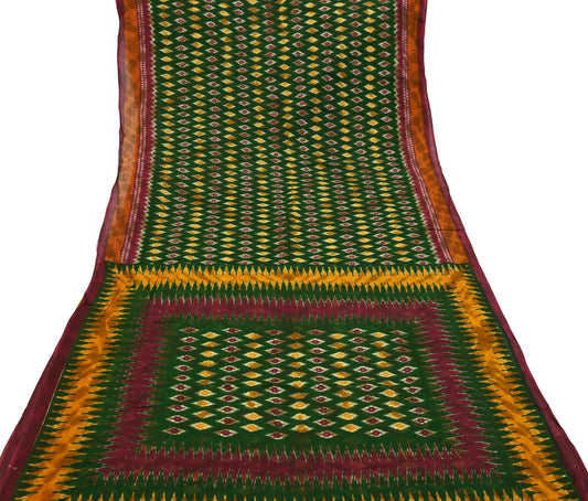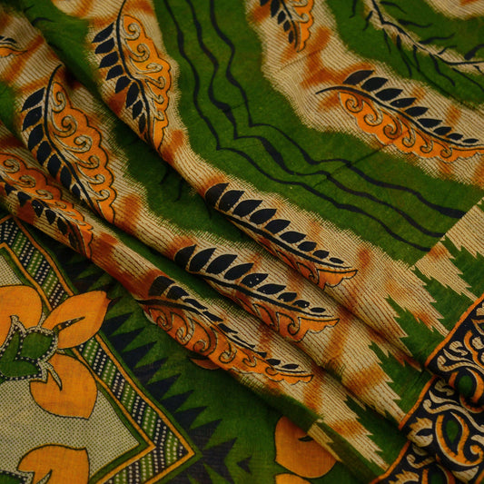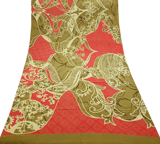 Indian Vintage Orange & Green Saree Pure Crepe Silk Printed Sari Craft Fabric 5yd Sewing Floral Soft Wrap Dress making Crafting Quilting