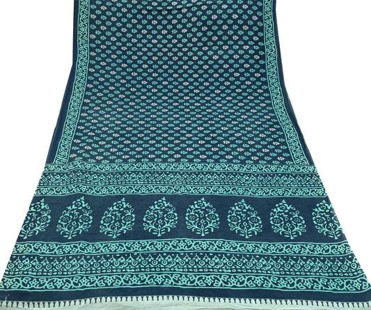 Indian Vintage Sari Blue Block Printed Pure Cotton Sarees 5Yd Craft Fabric Soft Sewing Sarong Wrap Boho Upcycle quilting Dress making