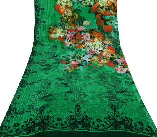 Indian Vintage Green & Black Saree Pure Georgette Silk Digital Printed Sari Sewing 5yd Craft Fabric Soft Floral Crafting Dress Making