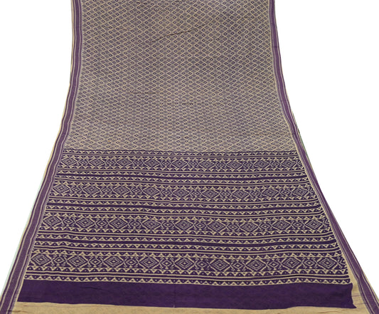 Indian Vintage Sari Beige & Purple Pure Cotton Printed Sarees Craft Fabric Soft 5Yd Sarong Wrap Boho Fabric Kimono Quilting Crafting Upcycle