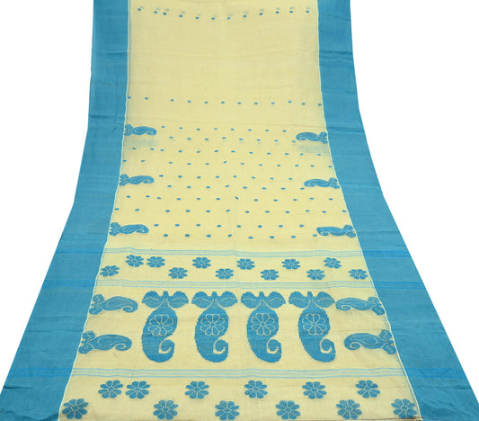 Indian Vintage Sari Beige Pure Cotton Hand Woven Sarees Craft Fabric 5yd Ethnic Paisley Crafting Upcycle Quilting Dress Making Quilting
