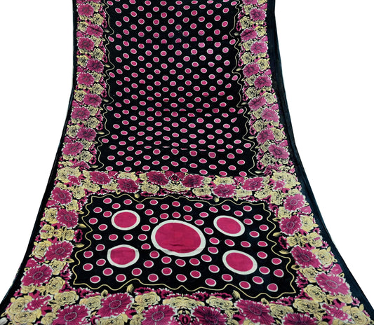 Indian Women Vintage Black Saree Pure Chiffon Silk Printed Sari Craft Fabric Sewing 5Yd Soft Light Sari Dress Making Floral