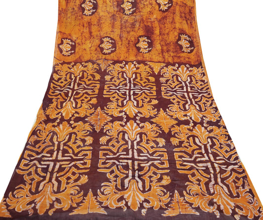 Indian Vintage Saffron & Brown Saree Batik Printed 100% Pure Cotton Sari Craft Fabric Soft 5Yd Sewing Sarong Wrap Boho Dress Making Upcycle