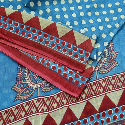 Indian Vintage Red & Blue Saree Pure Crepe Silk Printed Sari Craft Fabric 5yd Sewing Abstract Soft Craft Fabric Wrap Dress making