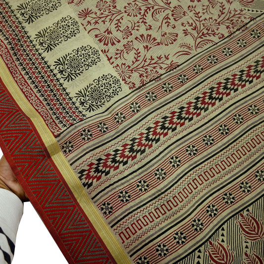 Indian Vintage Sari Ivory & Maroon Printed Pure Cotton Saree Fabric Soft Floral 5Yd Sarong Wrap Boho Fabric Kimono Soft