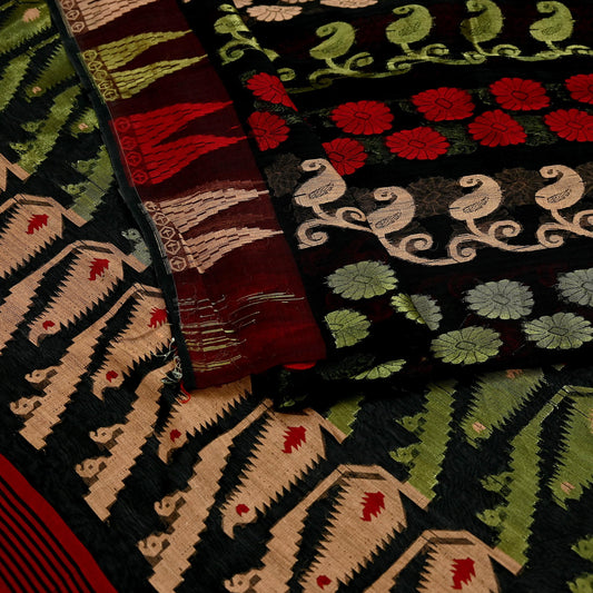 Indian Vintage Sarees Black Pure Cotton Hand Woven Jamdani Sari 5yd Ethnic Floral Craft Fabric Dress making Upcycle Crafting Quilting