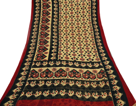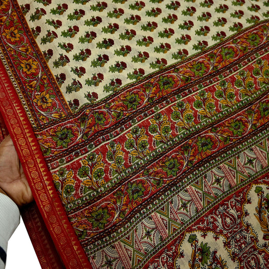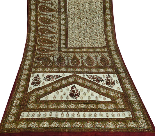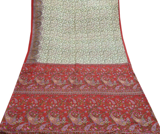 Indian Vintage Ivory & Red Saree Pure Silk Printed Sari 6yd Sewing Craft Fabric DressMaking Soft Wrap Crafting Quilting Used Paisley