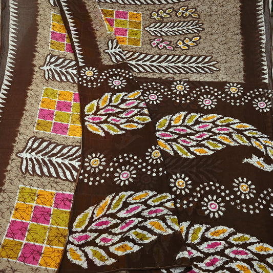 Indian Vintage Sari Brown Batik Printed 100% Pure Cotton Saree Craft Fabric 5Yd Soft Sewing Sarong Wrap Boho Dress making Crafting