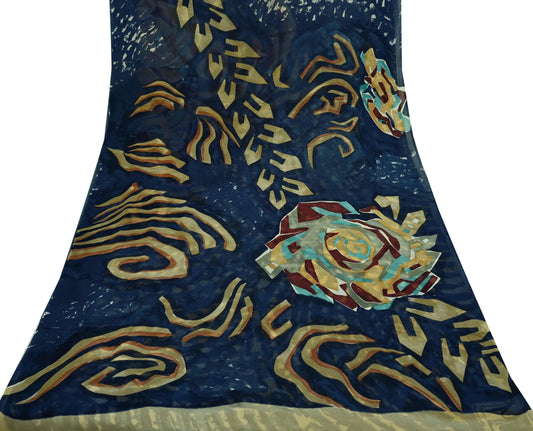 Indian Vintage Saree Ivory & Blue Pure Georgette Silk Printed Sari Sewing 5yd Craft Soft Floral Dress Designing for Crafting