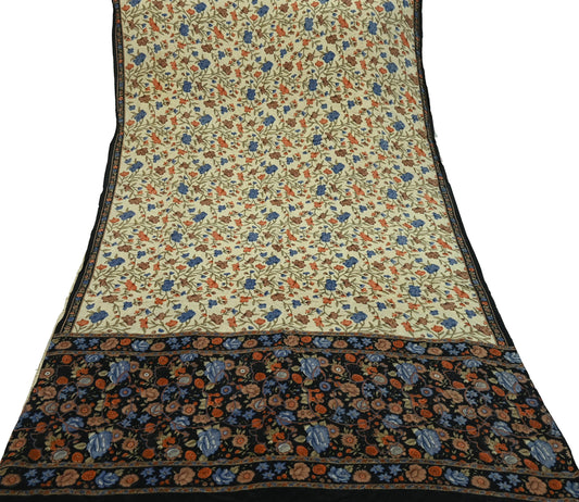 Indian Vintage Beige & Black Saree Pure Crepe Silk Printed Sari Craft Fabric 5yd Sewing Floral Soft Wrap Dress making Crafting Quilting
