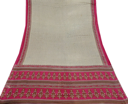Indian Vintage Sari Ivory & Pink Printed Blend Cotton Saree Craft Fabric 5Yd Soft Sewing Sarong Wrap Boho Floral Dress making Crafting