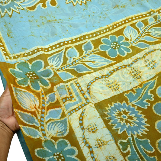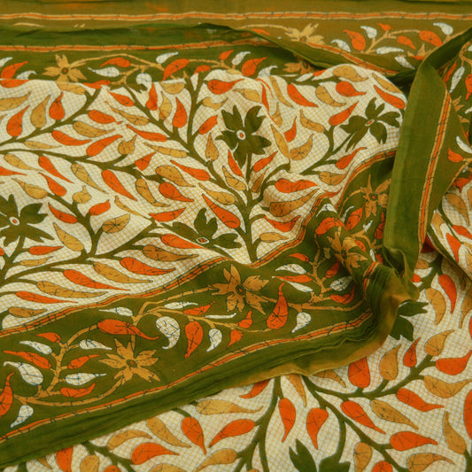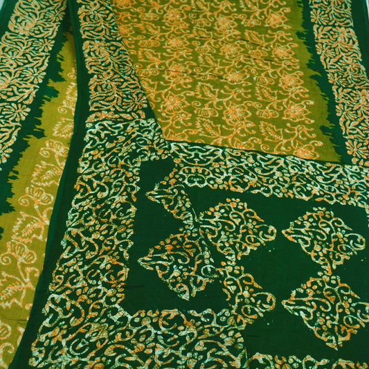Indian Vintage Sari Green & Saffron Batik Printed Saree 100% Pure Cotton 5Yd Craft Fabric Soft Sewing Sarong Wrap Boho Quilting Dress Making